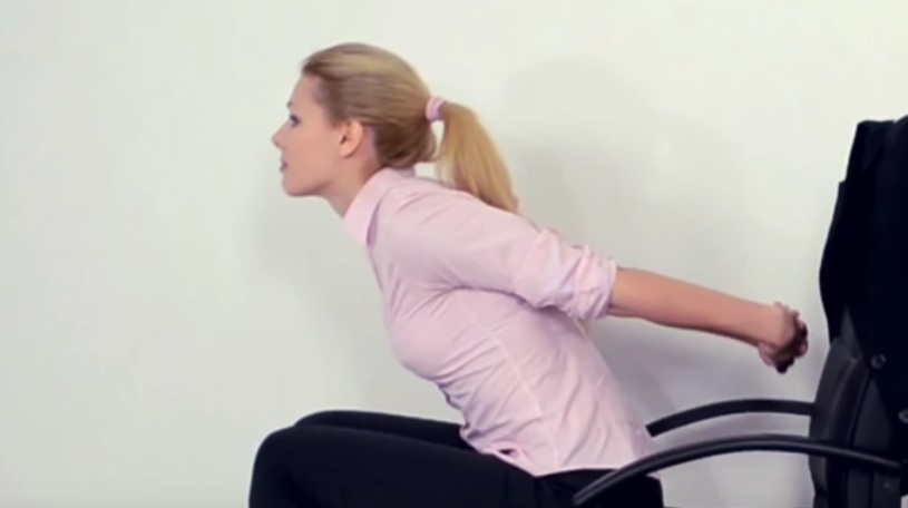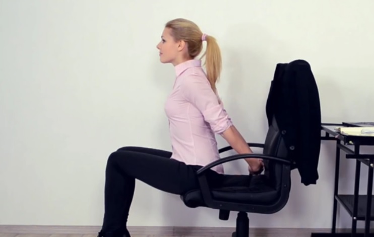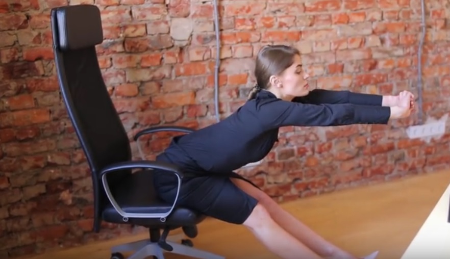 5. Отодвиньте кресло от стола и поставьте ноги на пятки. Выполните 5 наклонов. При этом старайтесь не прогибать спину, а держать ее ровно.