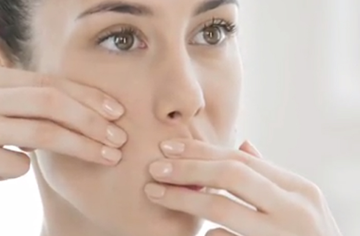 Пальцы одной руки поставьте под носогубную морщину, а пальцы другой — выше. Мягко растяните ткани в сторону, создавая своеобразную распорку.