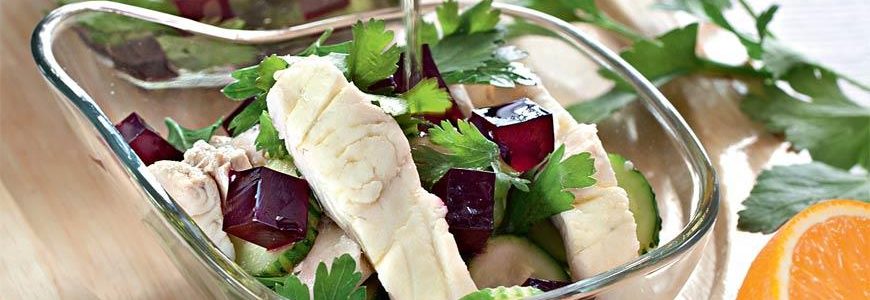 Салат с запеченной рыбой и свекольным желе. Когда я увидела этот салат, в первую очередь обратила внимание на фотографию – уж очень красиво смотрятся кусочки яркого желе на общем фоне. А приготовив, поняла, что желе здесь не только украшение, но и прекрасное дополнение к рыбе… После ужина ни одного алого кусочка в тарелках не осталось…