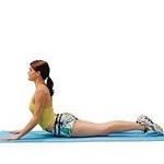Лягте на мат лицом вниз, сократите ягодицы, подтяните пресс. Выполните упражнение «лебедь» как показано на фото. Оторвите от пола верхнюю часть корпуса, одновременно напрягая ягодицы и «сводя» ноги, чтобы включить внутреннюю поверхность бедер. Потянитесь затылком вперед так, чтобы растянуть позвоночник. Фиксируйте позу 30 секунд, затем опуститесь на пол корпусом и выполните 30 подъемов и опусканий корпуса.