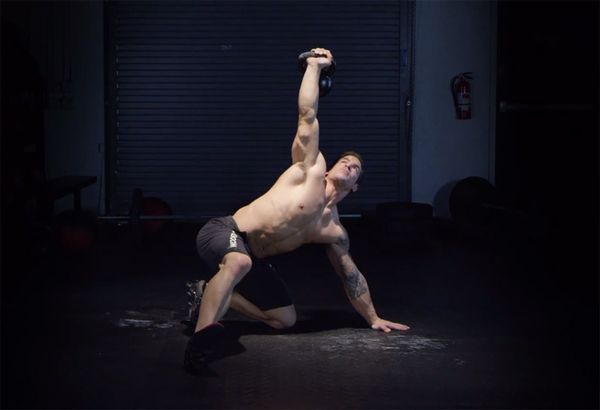 - Лечь на пол, гирю рукой вытолкнуть вверх над головой. Ногу, аналогичную поднятой руке, согнуть в колене и поставить на стопу.