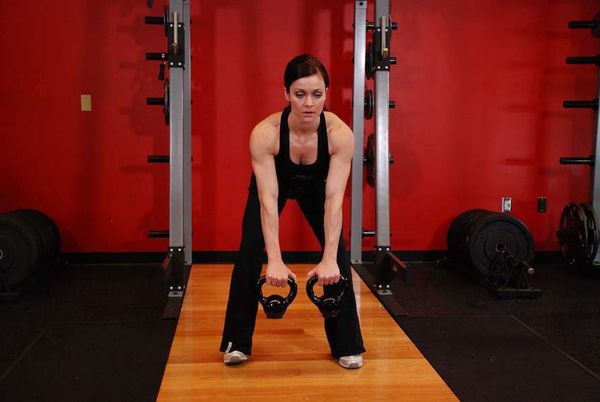 Занять положение стоя с ногами на ширине плеч, взять гирю обеими руками, согнуть ноги в коленях под углом в 30оС. Руки со снарядом удерживать между коленями, перпендикулярно к полу. Выпрямляя спину, нужно выносить гирю на уровень груди или шеи, то есть получается так называемый мах гирей. Далее возврат в исходную позицию. Повторять по возможности.