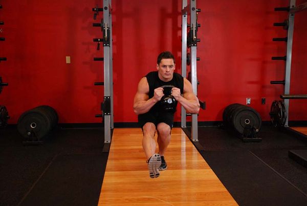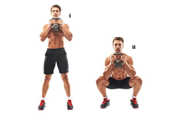 Исходное положение такое же, как и в упражнении с жимом – стоя с ногами, расположенными параллельно плечам, голова и спина на одной линии. Гирю взять обеими руками и фиксировать, прижав к груди. Следует выполнять приседания, не меняя положения снаряда. Следить, чтобы колени не выходили на уровень носков. Спина по возможности ровная. Повторить то количество раз, которое получается выполнить.