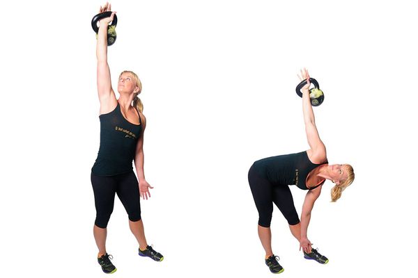 Выполняется стоя, ноги на ширине плеч, гиря в одной руке над головой. Делается наклон корпуса в сторону той руки, которая свободна. Наклон должен быть максимально низким. Далее следует возврат в исходное положение.