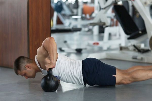 Человек должен выполнить планку, но упор делается не об пол, а об ручки силового приспособления. Корпус должен быть жестко зафиксирован, ягодицы и живот в особенном напряжении. Поочередно следует подтягивать гири к груди.