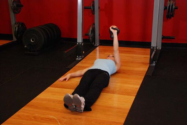 Позволяет активировать тонус мышц рук, груди и верхнего пресса. Необходимо лечь на спину, гирю взять обеими руками. Вытянуть руки под углом 90 градусов к туловищу, дал немного согнуть в локтях и завести за голову. Вернуть в начальную позицию. Делать от 7 до 12-17 раз.