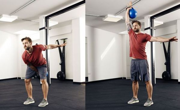 - Поднять гирю над головой, вытягивая руку, затем опустить.