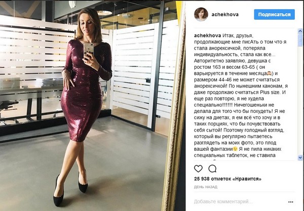 На днях Анфиса решила развеять тревожные мысли подписчиков и опубликовала пост, в котором попыталась описать свое нынешнее состояние и связанные с ним изменения во внешности. Ведущая утверждает, что не прикладывала никаких радикальных усилий, чтобы похудеть. Она настаивает, что не пила таблеток, не ложилась под нож хирурга и не сидит на жестких диетах. Анфиса отметила, что питается так, чтобы чувствовать себя сытой, однако старается не употреблять в пищу те продукты, которые делают ее «больной, усталой, плохо соображающей, агрессивной, несчастной и тяжелой». Чехова намекнула, что есть еще один секрет, который помог ей достичь таких ошеломляющих результатов, но она раскроет его подписчикам чуть позже, когда окончательно соберется с мыслями.