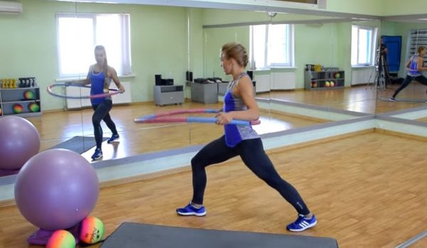 Согните одну гону в колене под углом 90 градусов – так, чтобы пятка располагалась на одной линии с коленной чашечкой. Другую ногу отставьте назад. Крутите обруч, сохраняя ту позу. Руки нужно держать скрещенными на уровне грудной клетки.