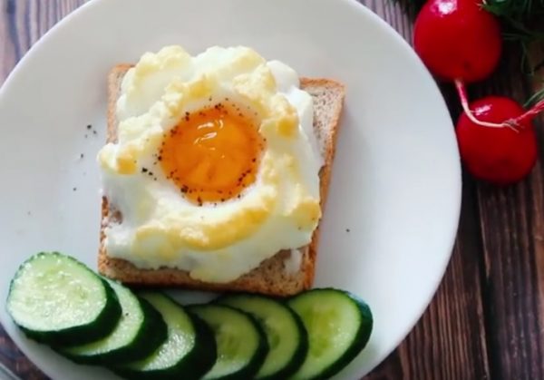 Желток и белок разделяем. Белок взбиваем в стойкую пену и выкладываем его на кусочек хлеба. В центре делаем небольшую выемку и отправляем в нее желток. Не забываем посолить и поперчить. Яичницу выпекаем в духовке 5-10 минут при температуре 200 градусов.