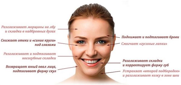 - избавление от носогубных и других складок на лице, что позволяет выглядеть моложе и привлекательнее.