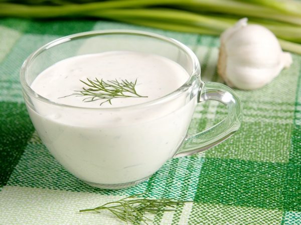 В кисломолочную основу добавить мелко порезанную зелень и измельченный чеснок, посолить по вкусу и оставить настояться около 10 минут.