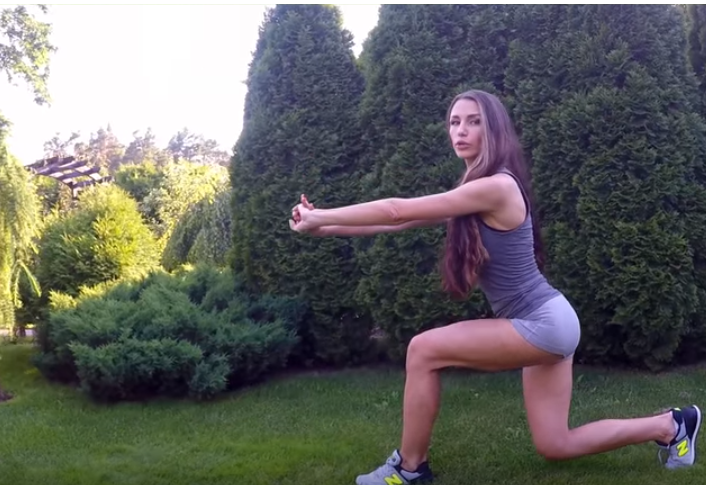Сделайте выпад ногой вперед, перенеся на нее нагрузку. Присядьте на нее плавно, без рывков.