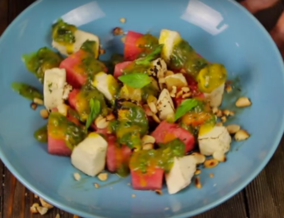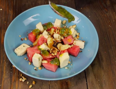 На тарелку выкладываем арбуз, сыр и несколько долек мандарина. Сверху посыпаем арахисом и поливаем соусом. Салат готов!