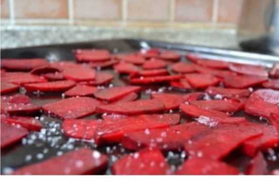 Свеклу нарежьте пластинками, разложите на противень и посолите их. Запекайте в духовке в течение 10 минут.