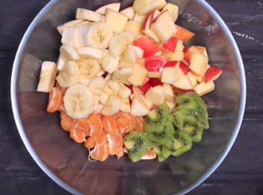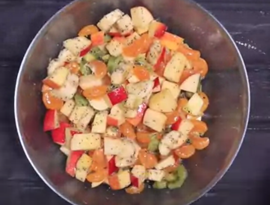 Добавляем соус в емкость с фруктами и хорошо перемешиваем. Салат готов!