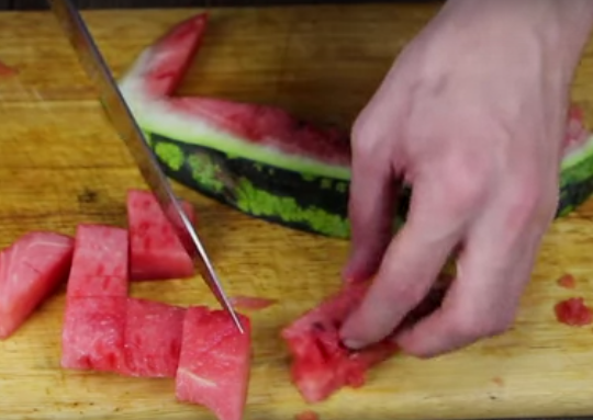 Освобождаем мякоть арбуза от косточек и нарезаем дольками.