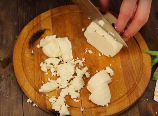 Сыр нарезаем на кусочки(можно это делать нарочито небрежно).
