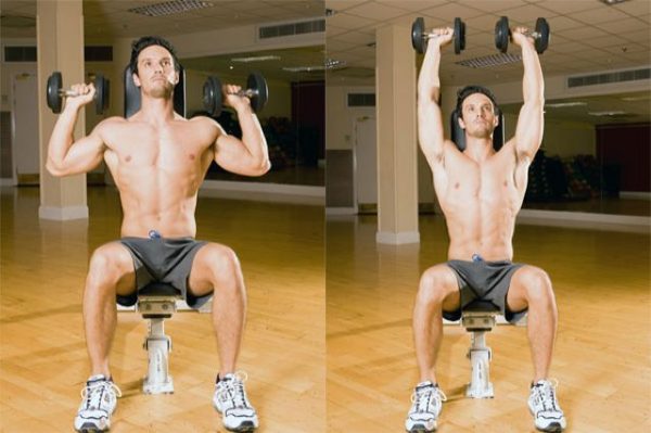 По сути, техника исполнения армейского жима из-за головы сидя не слишком отличается от предыдущего варианта. Разница заключается лишь в расположении тела: в данном случае придется сидеть, а не встать прямо. Упражнение помогает тщательно проработать верхние и средние пучки дельтовидной мышцы.