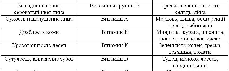 В первой колонке размещен список проблем с внешностью, во второй колонке определены витамины, которых не хватает, а в третьей колонке указаны продукты, которые содержат недостающие витамины.