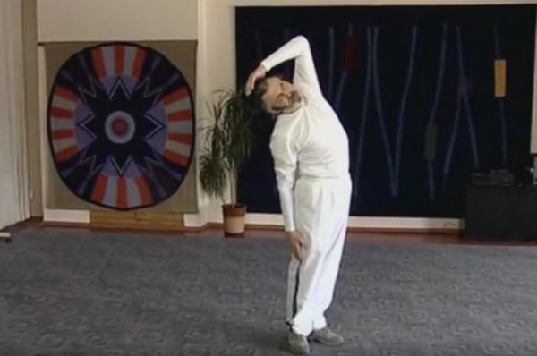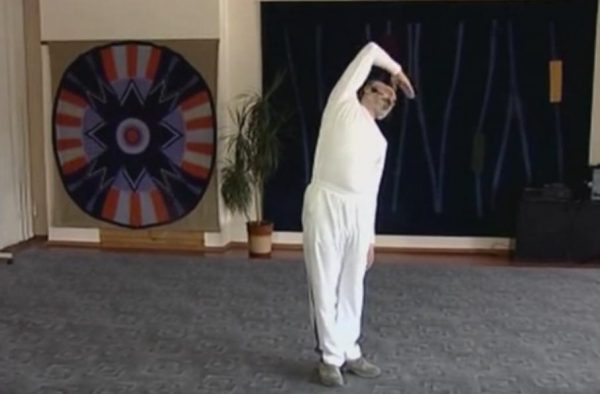 Встаньте прямо, сомкните пятки, а носки разведите врозь. На вдохе наклонитесь влево, одновременно переводя полусогнутую правую руку за голову. Сделайте выдох и распрямитесь.
