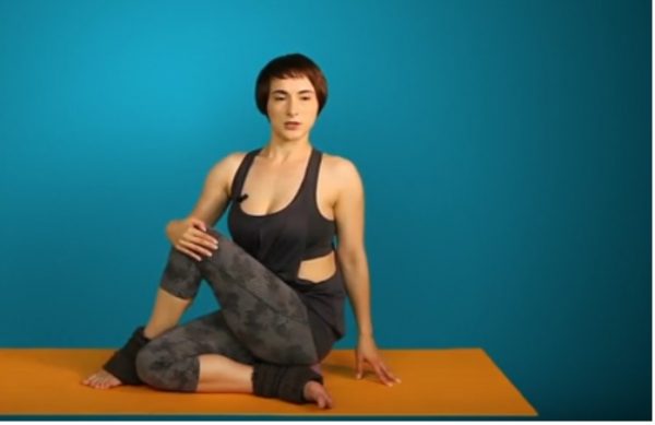 Расположитесь на коврике и вытяните ноги, затем согните левую ногу и заведите правую ногу под нее. Стопу левой ноги перенесите через лежащее на полу правое бедро и обопритесь об пол, а правую уберите за колено. Старайтесь повернуть туловище как можно сильнее. В данной позиции оставайтесь пару минут, а затем повторите ее на другую сторону.