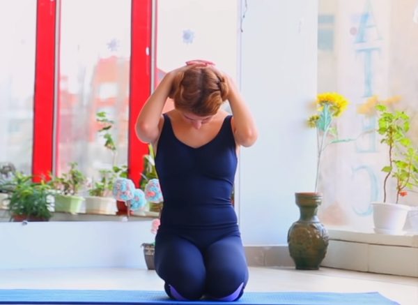 Растягиваем заднюю поверхность шеи. Исходная позиция – сидя на полу, прямые ноги вытянуты вперед, спина ровная. Стопы тянем на себя и фиксируем в этом положении. Вы должны почувствовать напряжение голеней. Руки складываем в замок и кладем на затылок. Полностью расслабляем руки. Под их тяжестью голова опускается вниз, подбородок стремится к груди. Сидим в таком положении 3-5 минут.