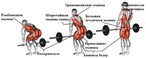 - спины – активно задействуются разгибатели позвоночника, включая область поясничного отдела, кроме того, функционируют широчайшие мышцы спины;