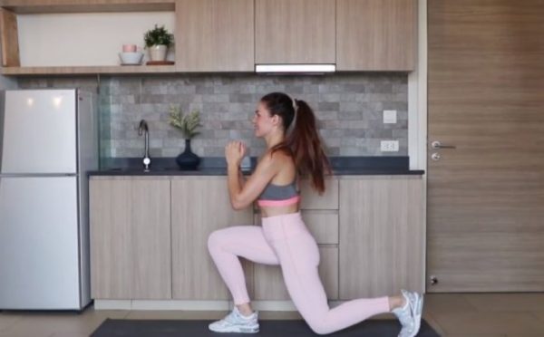 Примите положение устойчивого выпада. Руки расположите перед собой.