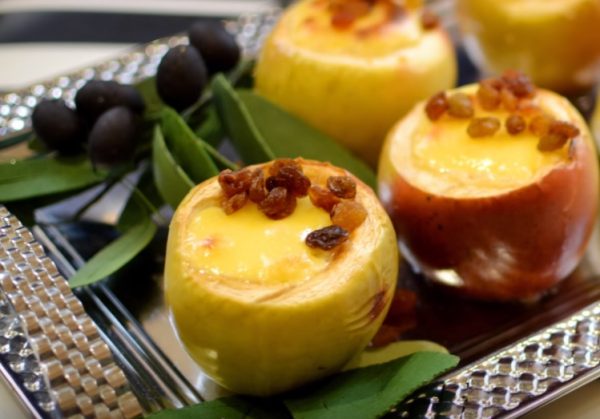 Срежьте у яблока “крышечку”, а затем выньте из него мякоть. Должен получиться своеобразный горшочек. Творог смешайте с медом до однородности и добавьте изюм (вместо изюма можно добавить цукаты). Наполните яблочный горшочек творожной начинкой и поставьте в микроволновку на несколько минут. Сверху можно посыпать корицей и украсить изюмом.